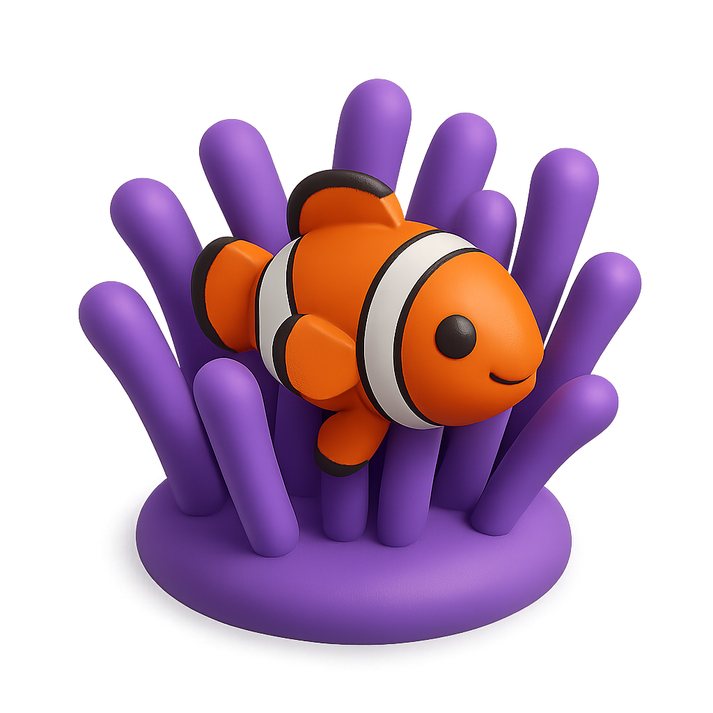 /Collection: /by davooda/Type: PNG/A charming 3D illustration of a clownfish swimming within a vibrant purple anemone. The image features a friendly clownfish with orange and white stripes, set against a soft gradient background that enhances its 3D effect.