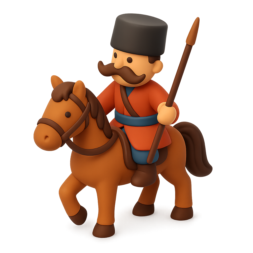 A 3D icon depicting a Cossack cavalryman riding a horse, featuring a vibrant design with a transparent background and a three-quarter view for depth.