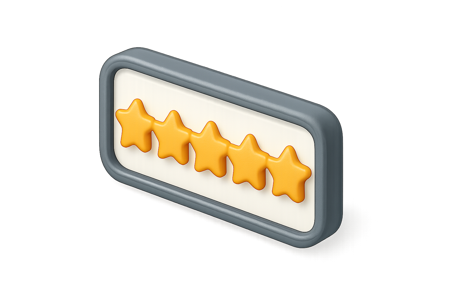 A visually appealing 3D icon featuring five orange stars within a rectangular gray border, designed for rating and reviews. The icon has a transparent background and presents a volumetric feel.
