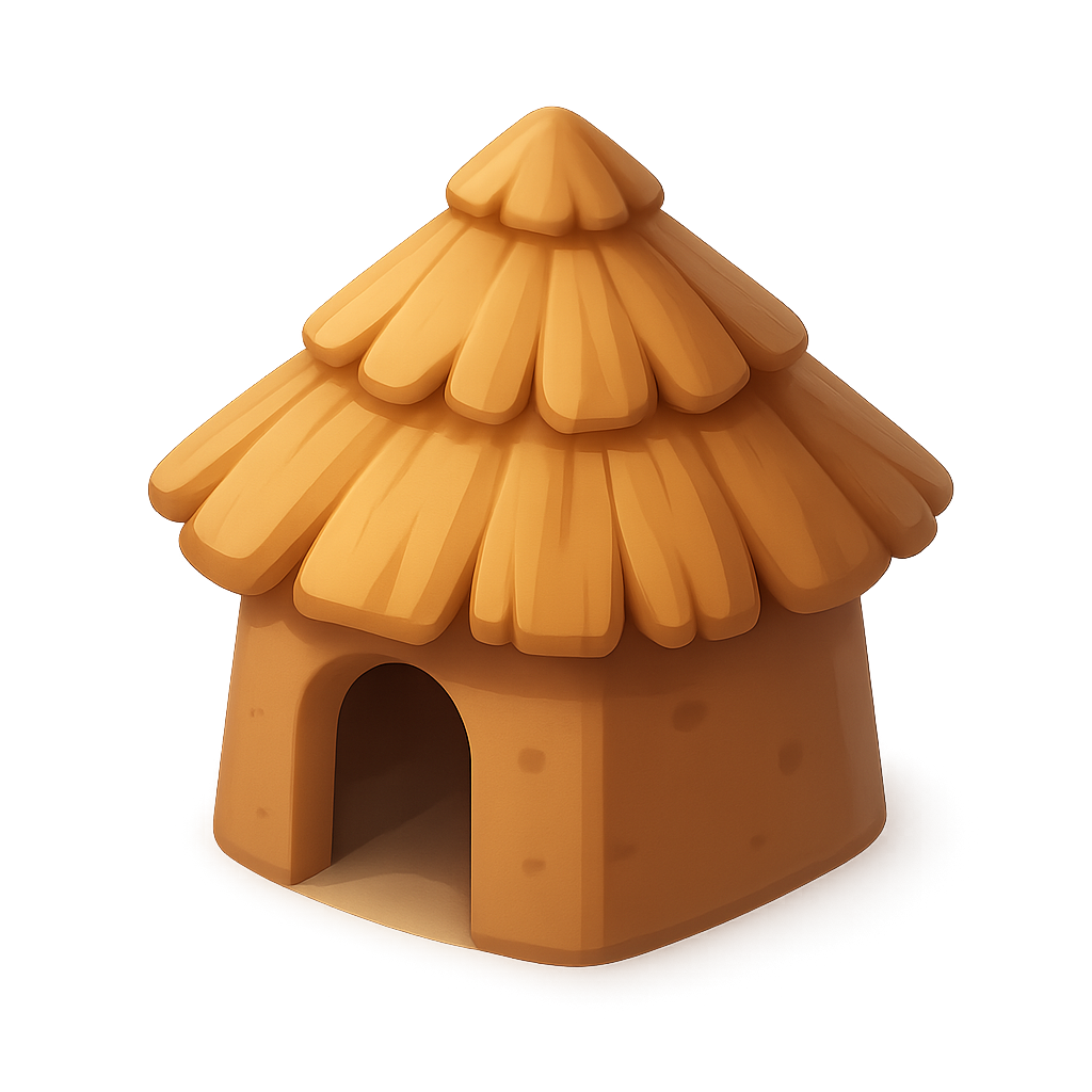 A stylized 3D icon of a primitive hut featuring a rounded shape and a textured thatched roof, designed with a three-quarter view for a volumetric appearance.