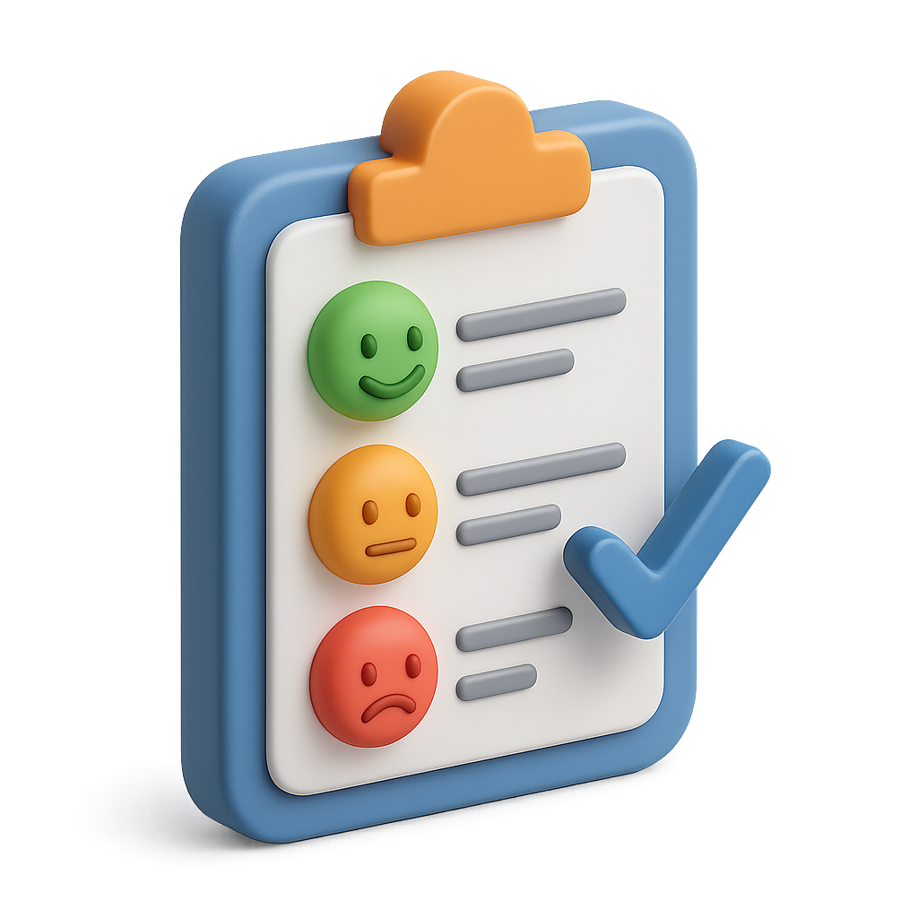 /Collection: /by davooda/Type: PNG/A vibrant 3D icon depicting a feedback form with smiley faces and a checkmark. The design features a transparent background and an isometric perspective, emphasizing a volumetric look.