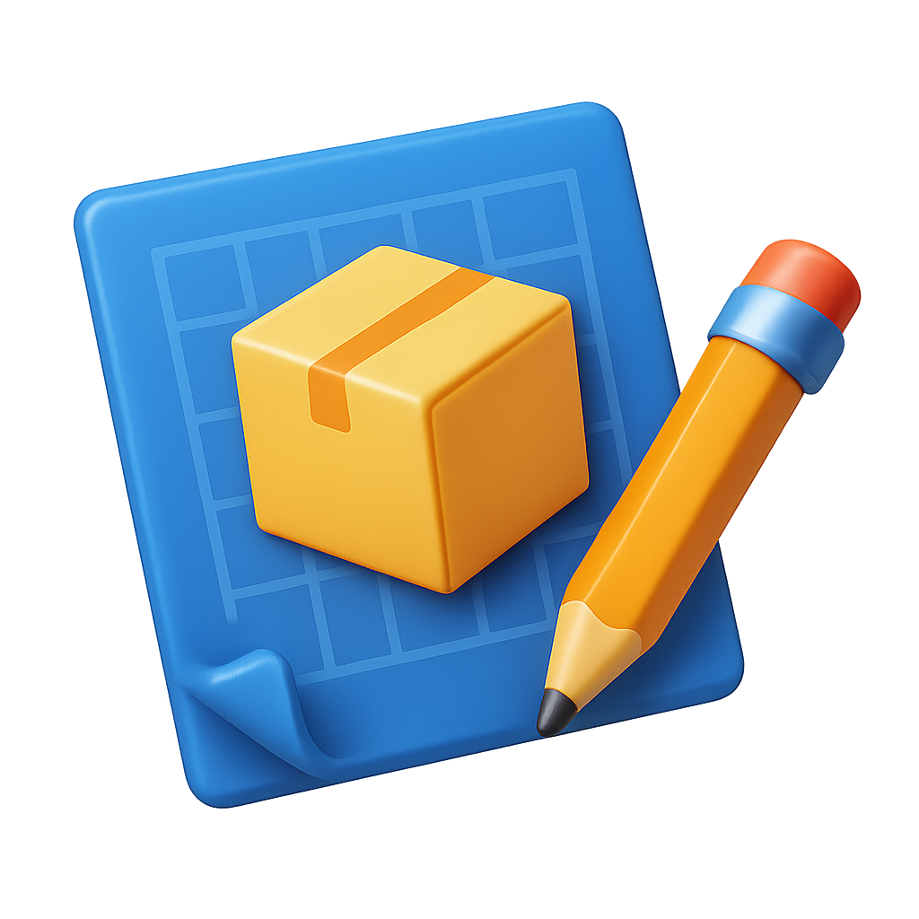 /Collection: /by davooda/Type: PNG/A vibrant 3D blueprint icon featuring a yellow box and an orange pencil on a blue grid background. The design showcases a three-quarter view with a volumetric feel.