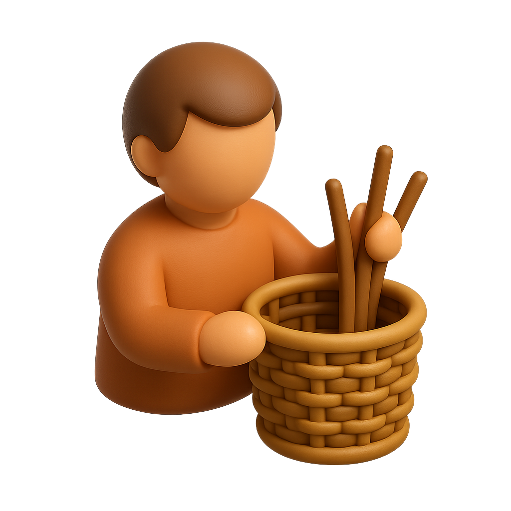 A stylized 3D representation of a basket weaver holding willow sticks, featuring a warm color palette and a three-quarter view for a dynamic look.