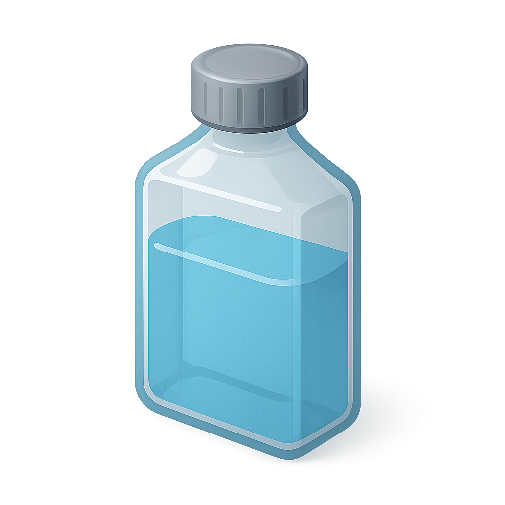 /Collection: /by davooda/Type: PNG/A 3D icon of a saline solution bottle, depicted in a three-quarter view with a transparent background. The bottle features a gray cap and a blue liquid inside, showcasing a volumetric and isometric design.