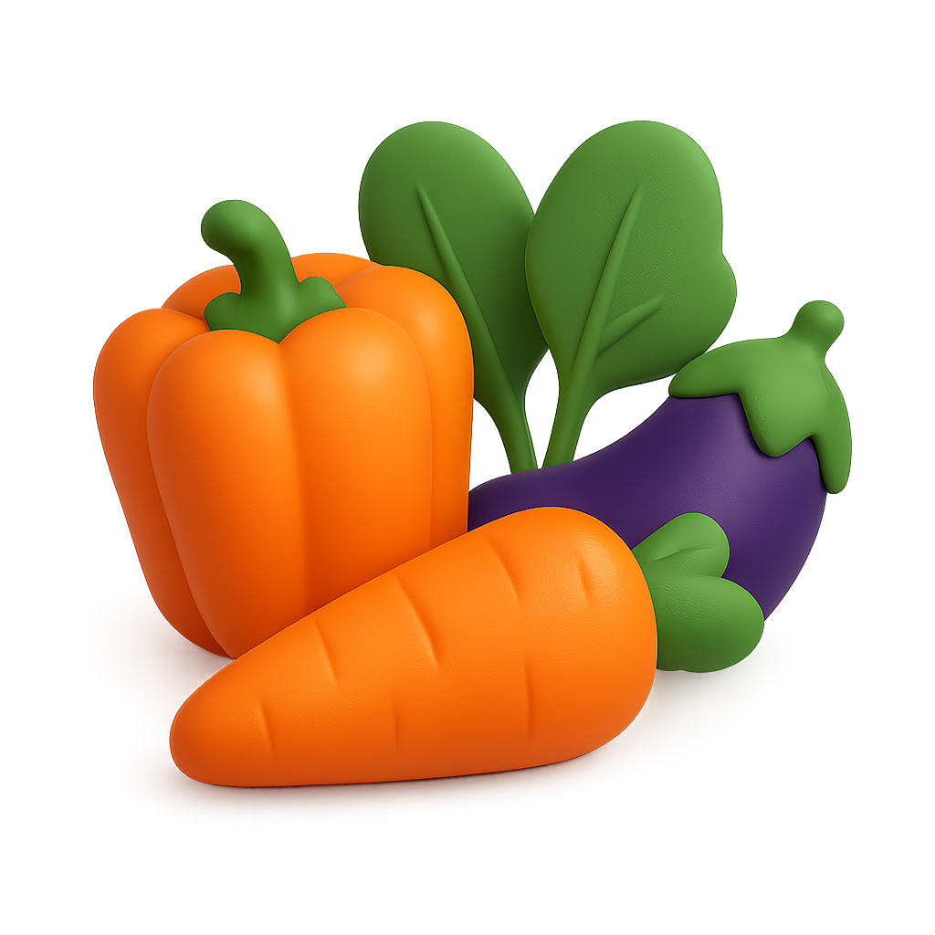 /Collection: /by davooda/Type: PNG/A vibrant 3D icon showcasing a bell pepper, carrot, and eggplant in an isometric view. The design features a smooth, volumetric appearance with a transparent background.