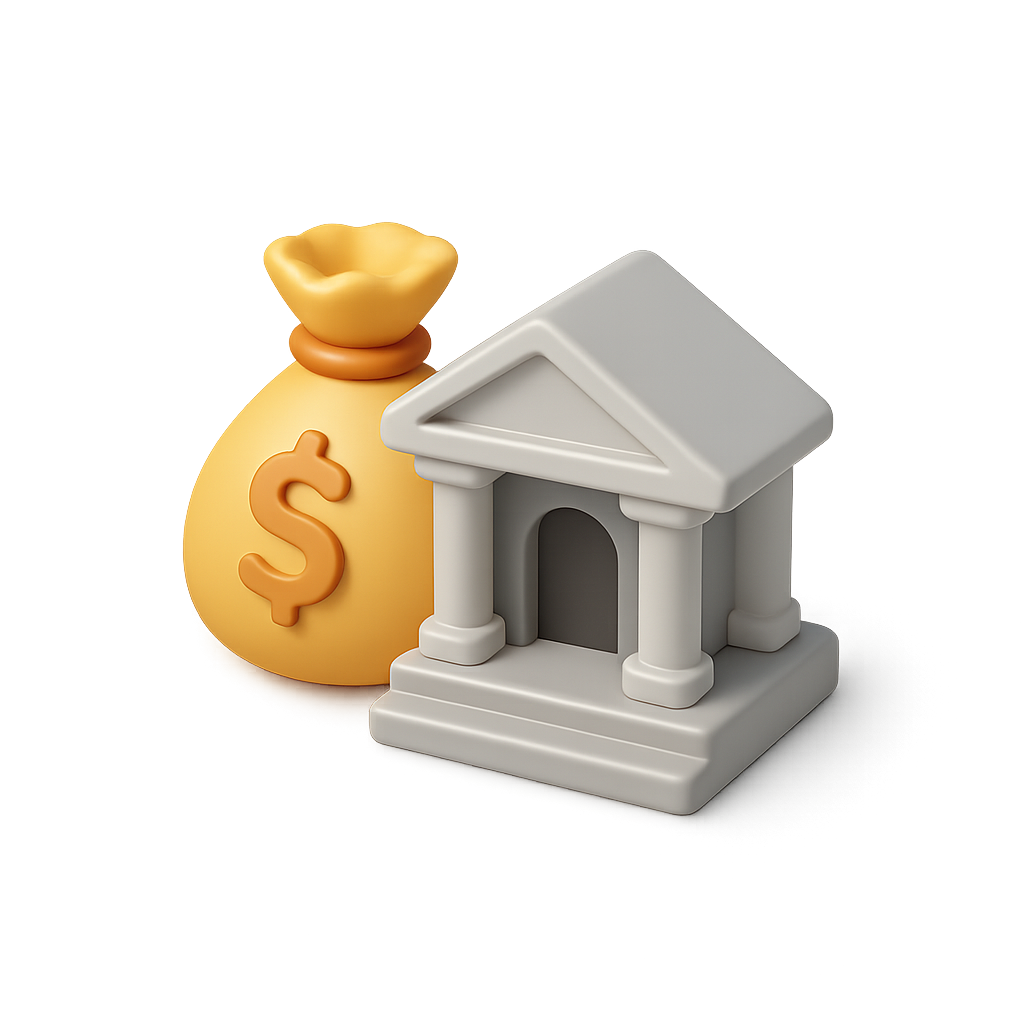 A visually appealing 3D icon featuring a money bag alongside a bank structure, designed in a three-quarter isometric view with a soft gradient background.