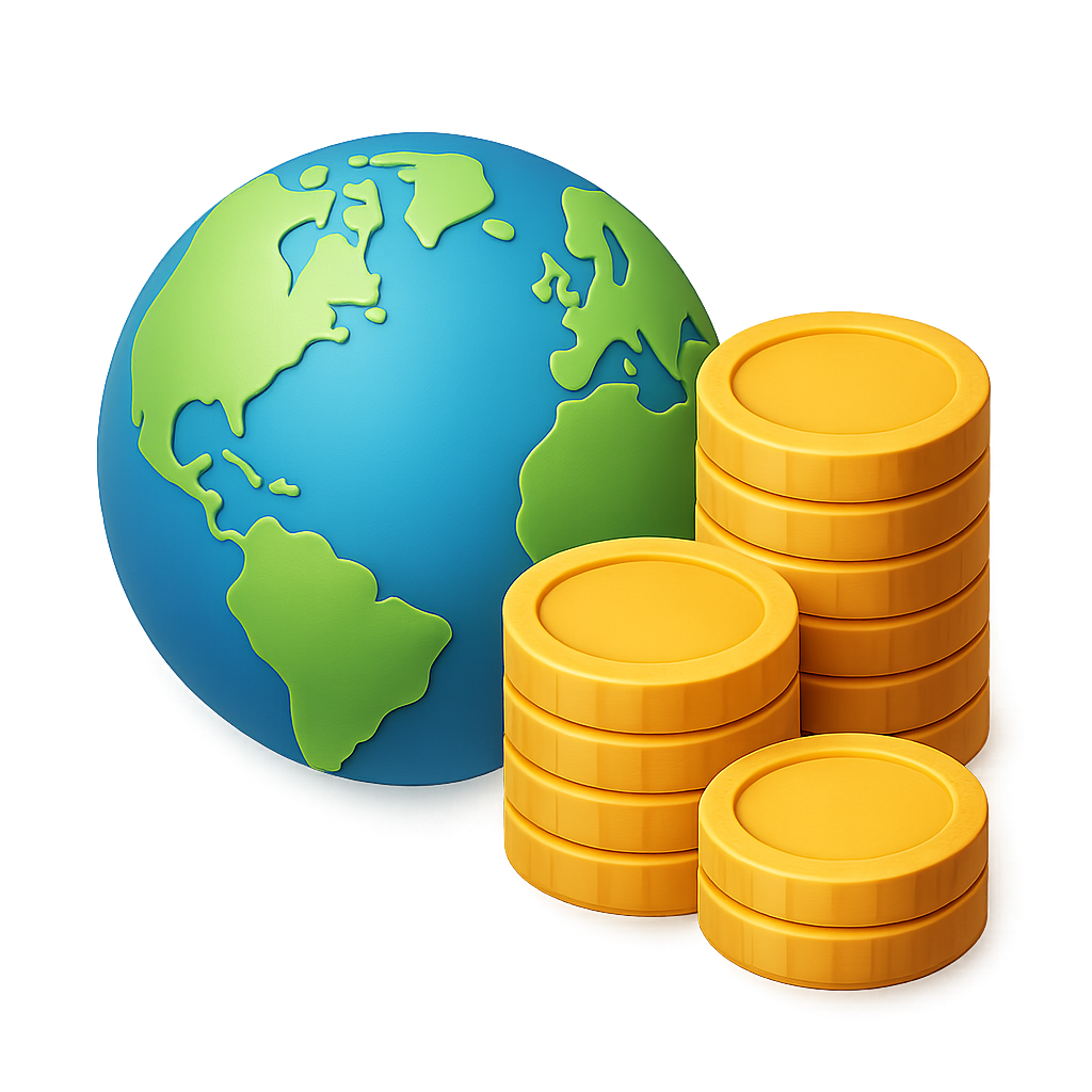 /Collection: /by davooda/Type: PNG/A colorful 3D globe depicting Earth, accompanied by stacks of yellow coins. The design features a smooth, isometric style with a transparent background, emphasizing a financial theme.