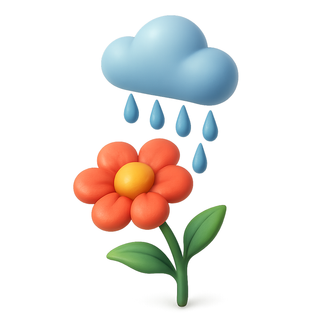 A colorful 3D flower icon with vibrant petals and a central yellow stamen, under a stylized blue cloud emitting raindrops, set against a gradient background.