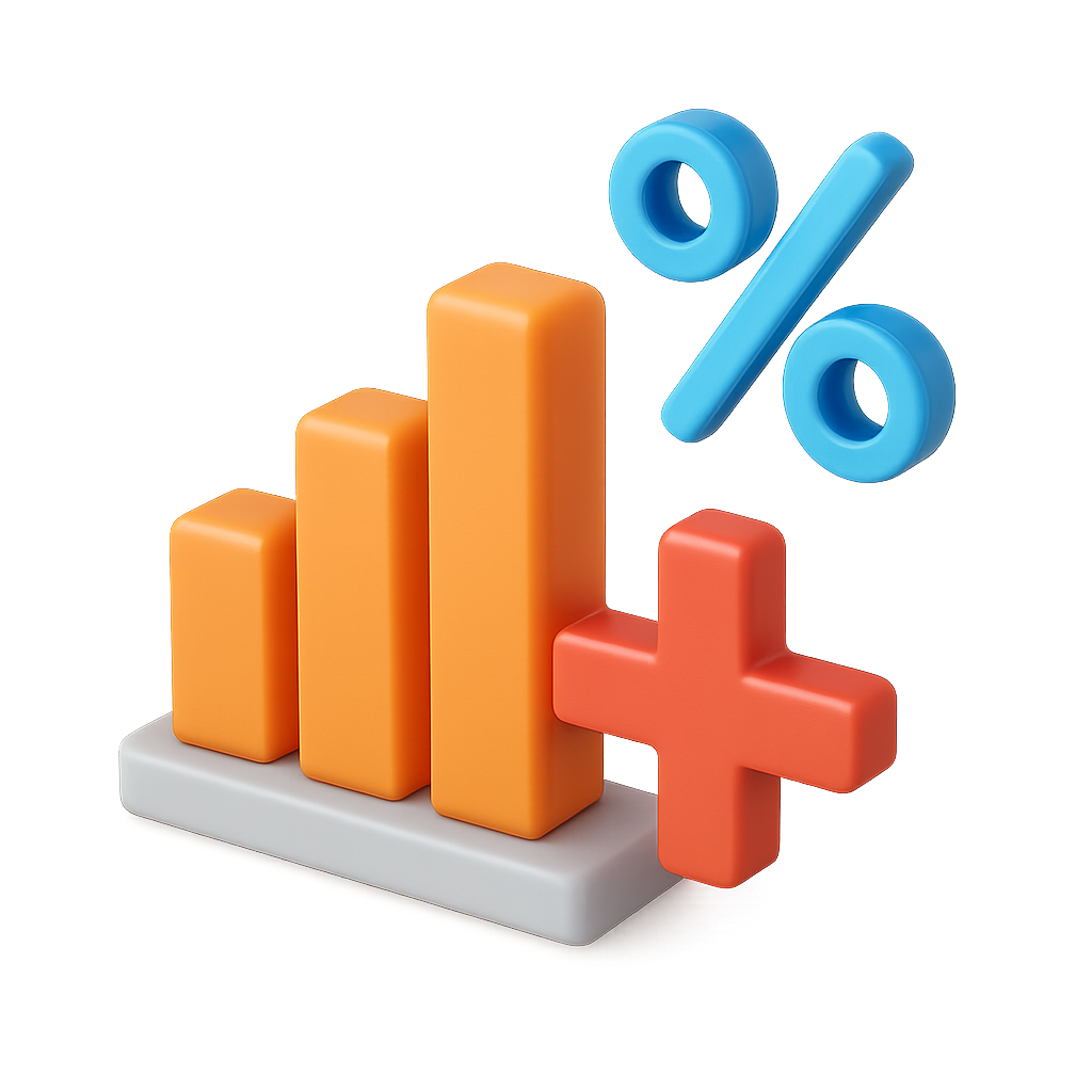 A vibrant 3D icon featuring a bar graph with orange bars, a plus sign, and a blue percentage symbol, all set against a subtle gradient background.