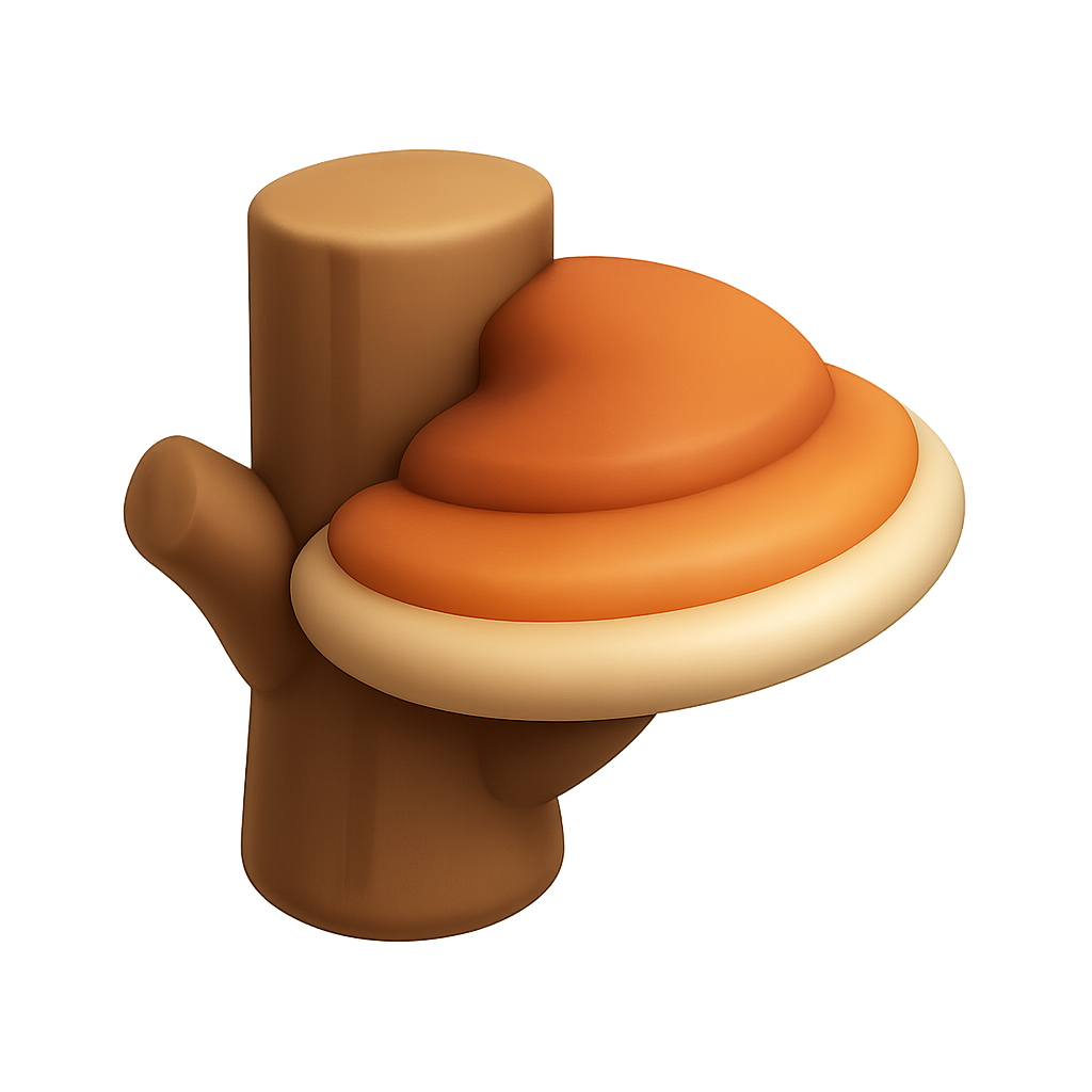 A stylized 3D icon of a bracket fungus attached to a tree stump, featuring a smooth, volumetric design with warm orange and cream colors.