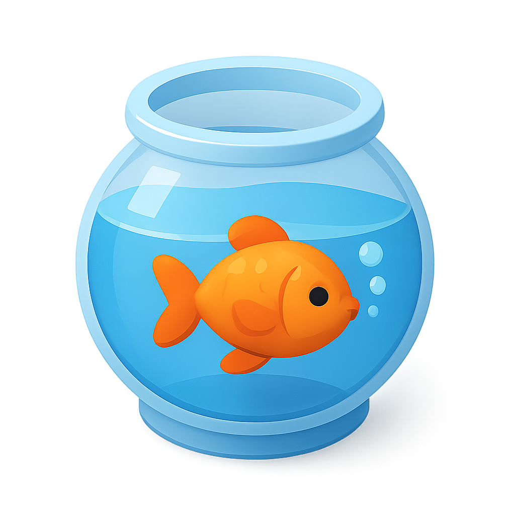 A vibrant 3D icon of a goldfish bowl featuring a playful orange goldfish swimming inside, designed with a transparent background and an isometric perspective.