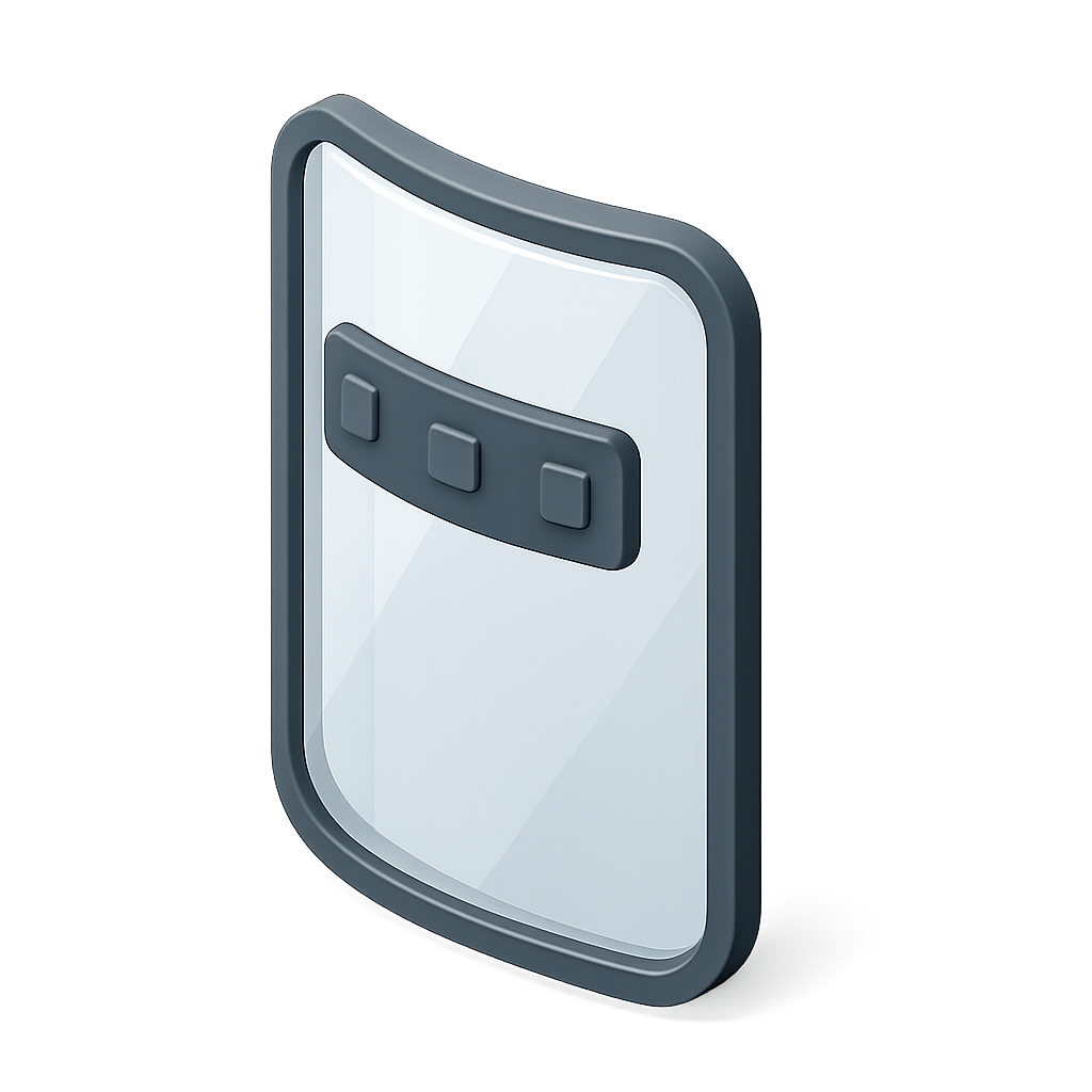 /Collection: /by davooda/Type: PNG/A sleek, 3D-rendered riot shield icon appears in a three-quarter view. The shield features a glossy finish with a gray outline and three buttons, set against a subtle gradient background.