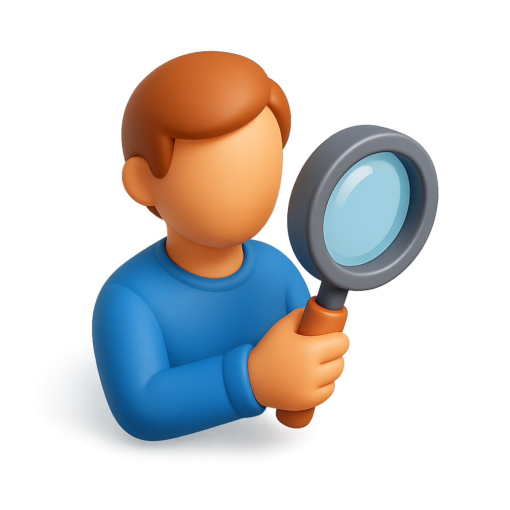 A 3D icon featuring a person holding a magnifying glass, showcased in an isometric view. The design is simplistic with a colorful character and a transparent background.