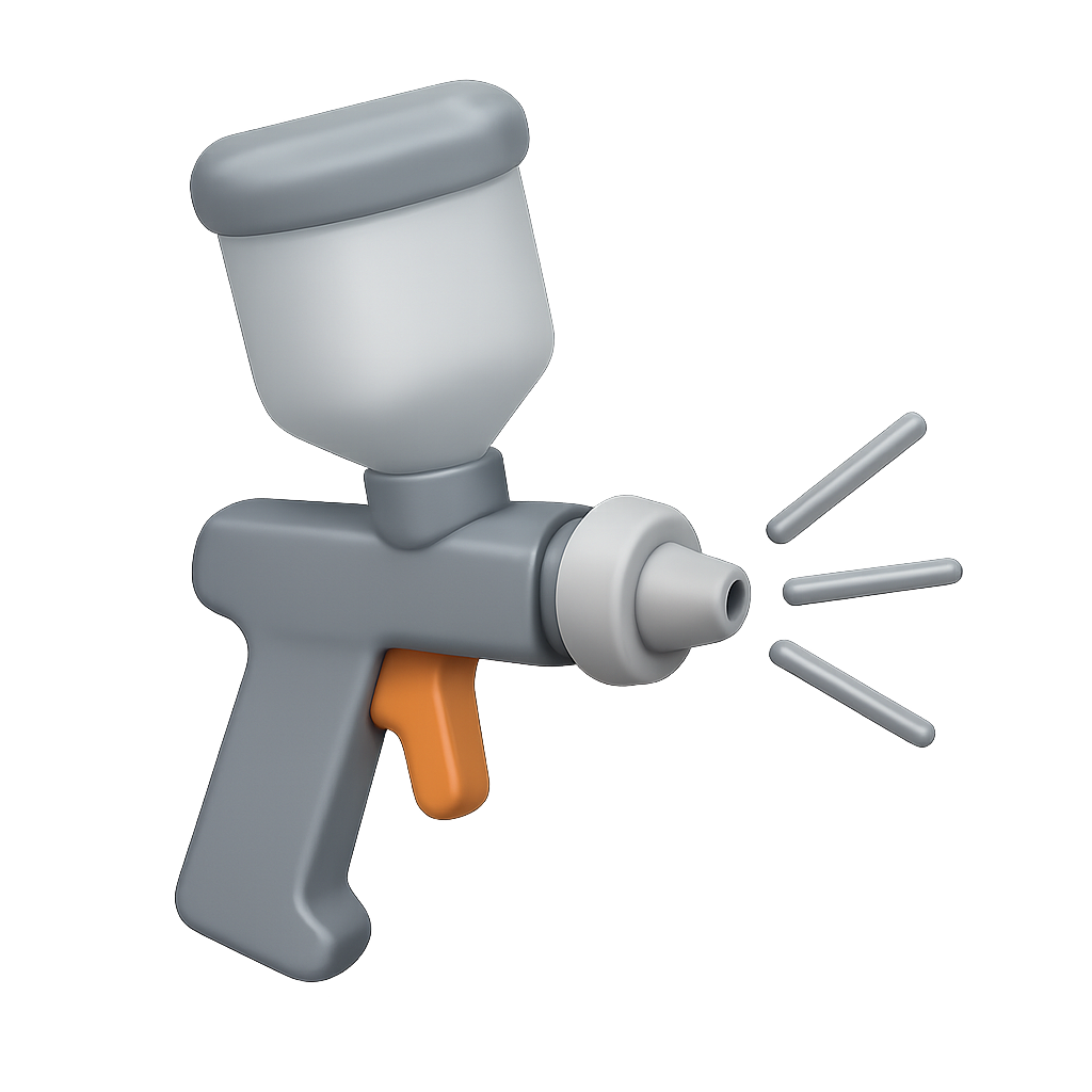 A visually appealing 3D icon of a paint sprayer, featuring a spray gun design with a transparent background and volumetric detailing. It showcases a three-quarter view with a realistic appearance.