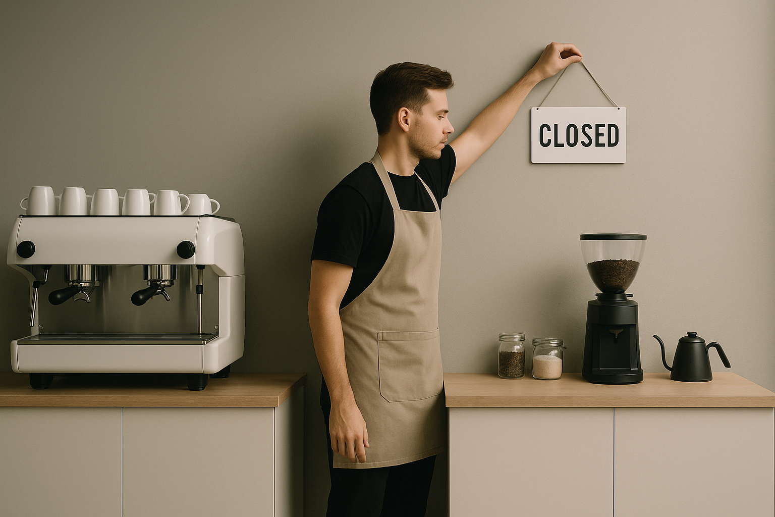 A barista in a minimalist café setting hangs a 'CLOSED' sign. The scene features a modern espresso machine, a grinder, and stylish decor, highlighting the end of a workday.