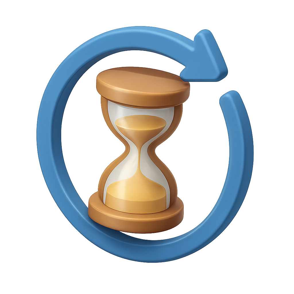 A visually appealing 3D hourglass icon featuring a circular arrow around it. The hourglass has a wooden base and golden sand, set against a transparent background.