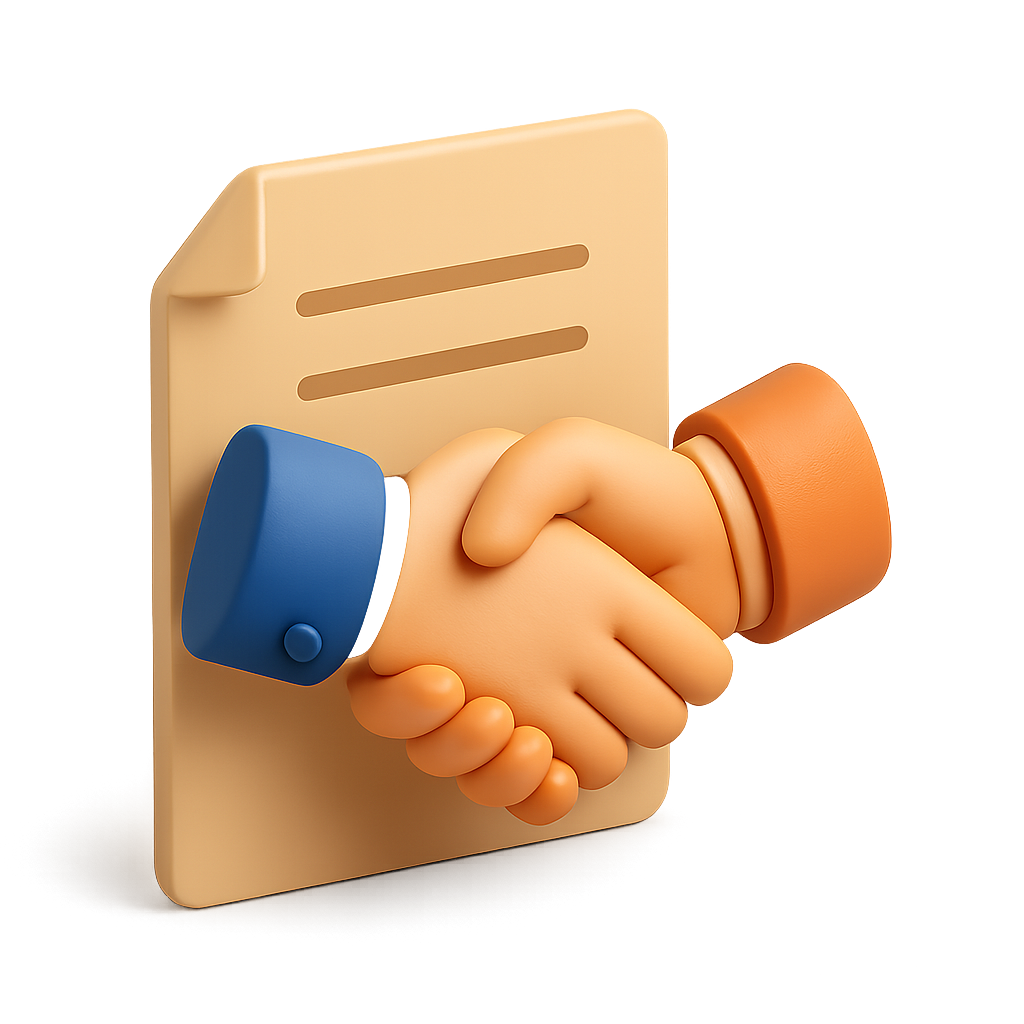 /Collection: /by davooda/Type: PNG/A visually appealing 3D icon depicting a handshake symbolizing alliance, set against a document backdrop. The design features vibrant colors and a three-quarter view.