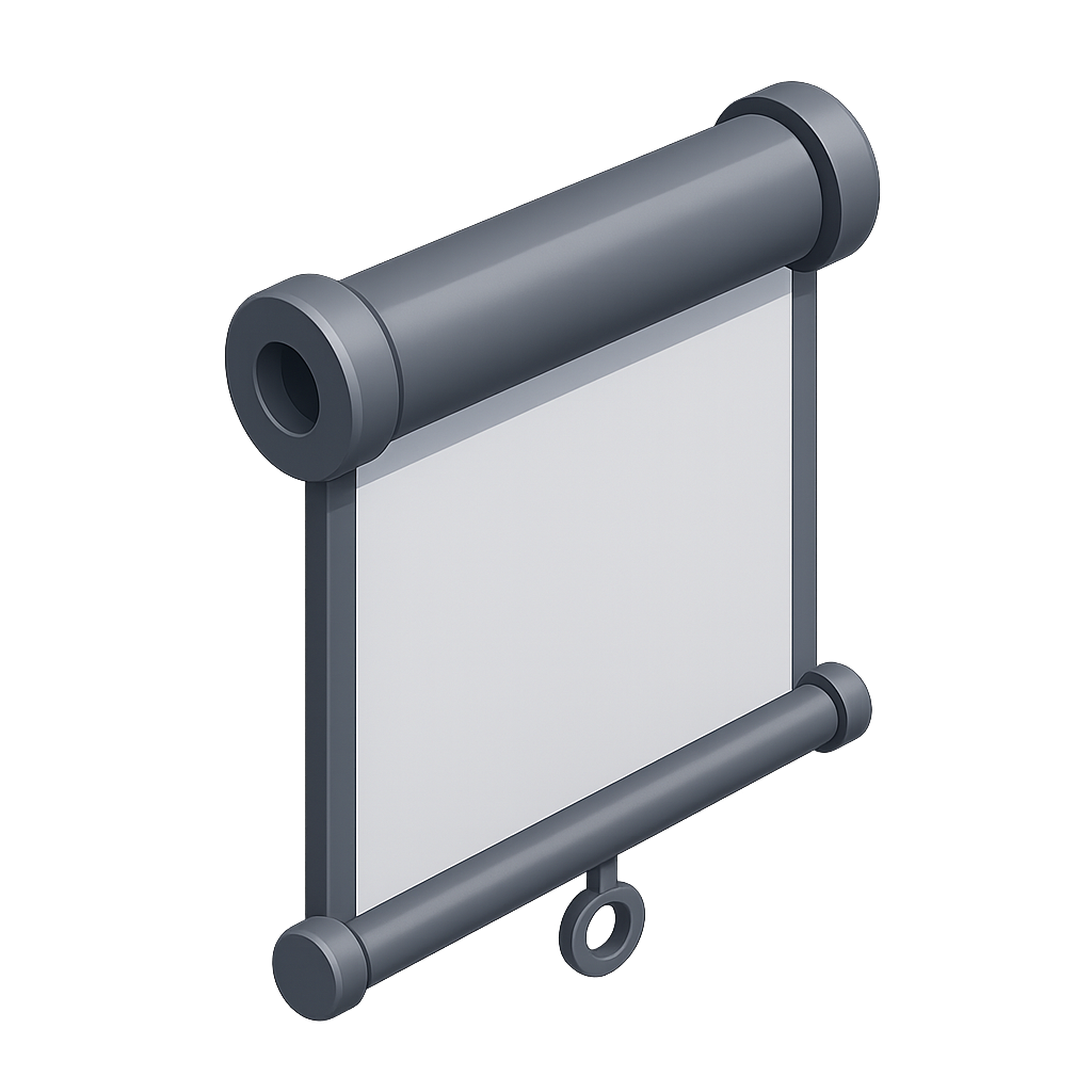 A 3D icon depicting a rollable screen mechanism, presented in a three-quarter isometric view. The design features a cylindrical top and bottom with a blank screen in between, all on a transparent background.