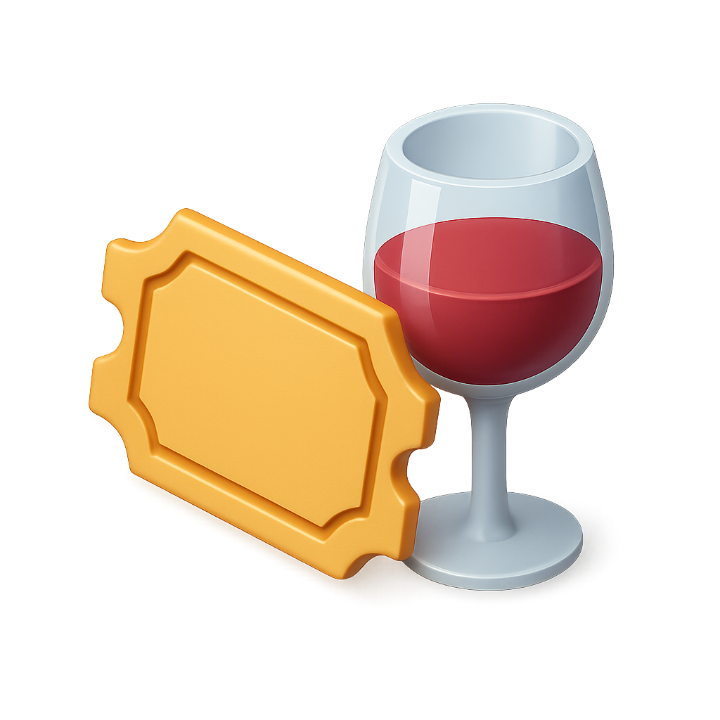 /Collection: /by davooda/Type: PNG/A 3D rendering of a wine glass filled with red wine and an orange ticket. The glass features a sleek design, and the ticket has a unique shape, both presented in a three-quarter view.