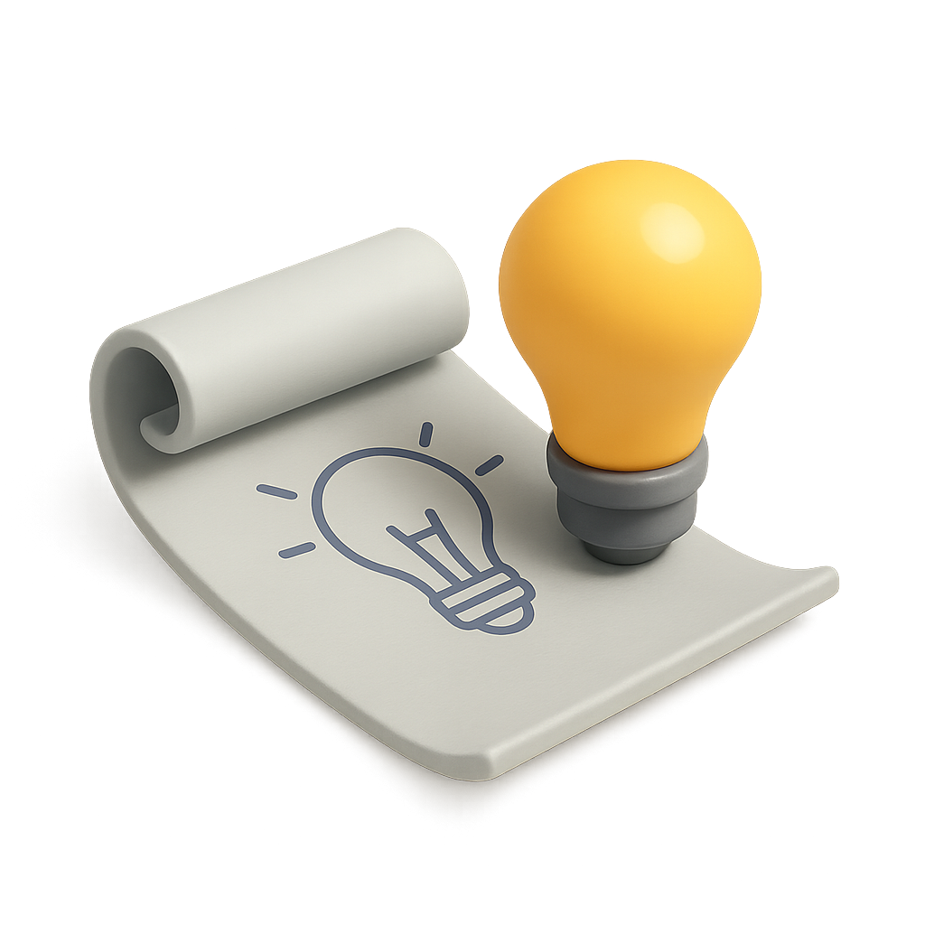 A 3D icon displaying a rolled-up plan with a light bulb, designed with a transparent background and volumetric feel, highlighting creativity and innovation.