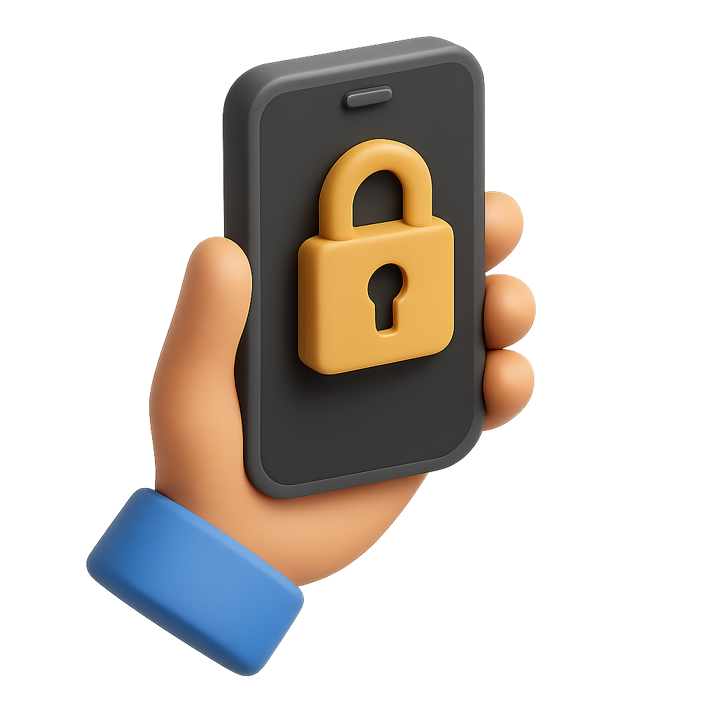 A 3D illustration of a hand holding a smartphone featuring a lock icon, designed with a transparent background. The isometric view enhances the volumetric feel.