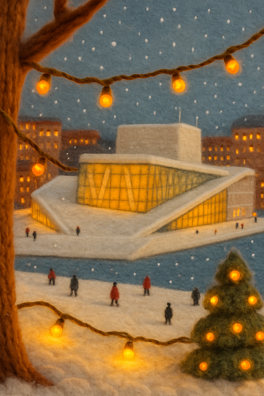 /Collection: /by davooda/Type: PNG/A charming 3D felt art depiction of the Oslo Opera Theater, featuring a snowy foreground and layered backgrounds. The scene is filled with warm lights, a festive atmosphere, and tiny figures enjoying the winter scenery.