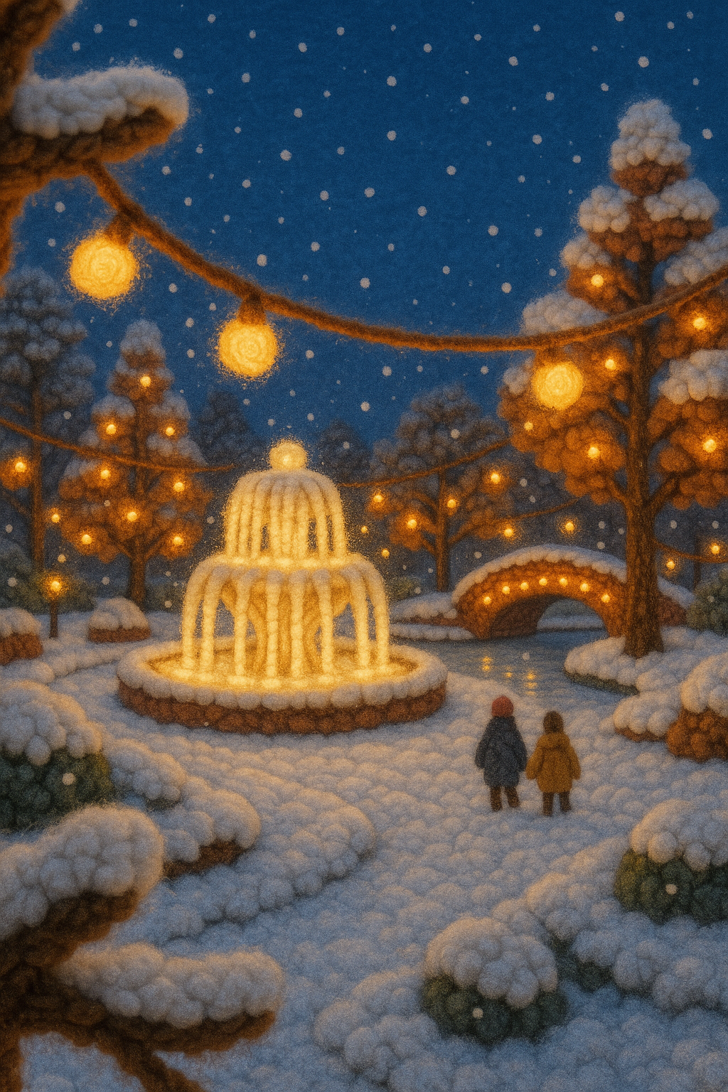 /Collection: /by davooda/Type: PNG/A charming winter scene featuring a fountain adorned with lights, surrounded by fluffy snow-covered trees. Two small figures admire the festive atmosphere as snow gently falls.