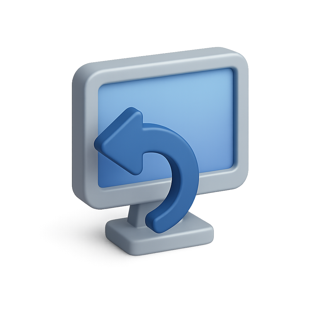 /Collection: /by davooda/Type: PNG/A stylized 3D undo icon depicting a blue arrow curving back towards a computer monitor. The design features a transparent background and a three-quarter view, enhancing its volumetric feel.