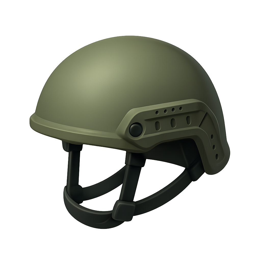 A sleek, modern ballistic helmet depicted in a three-quarter 3D view. The design features a smooth surface and isometric details, set against a soft gradient background.