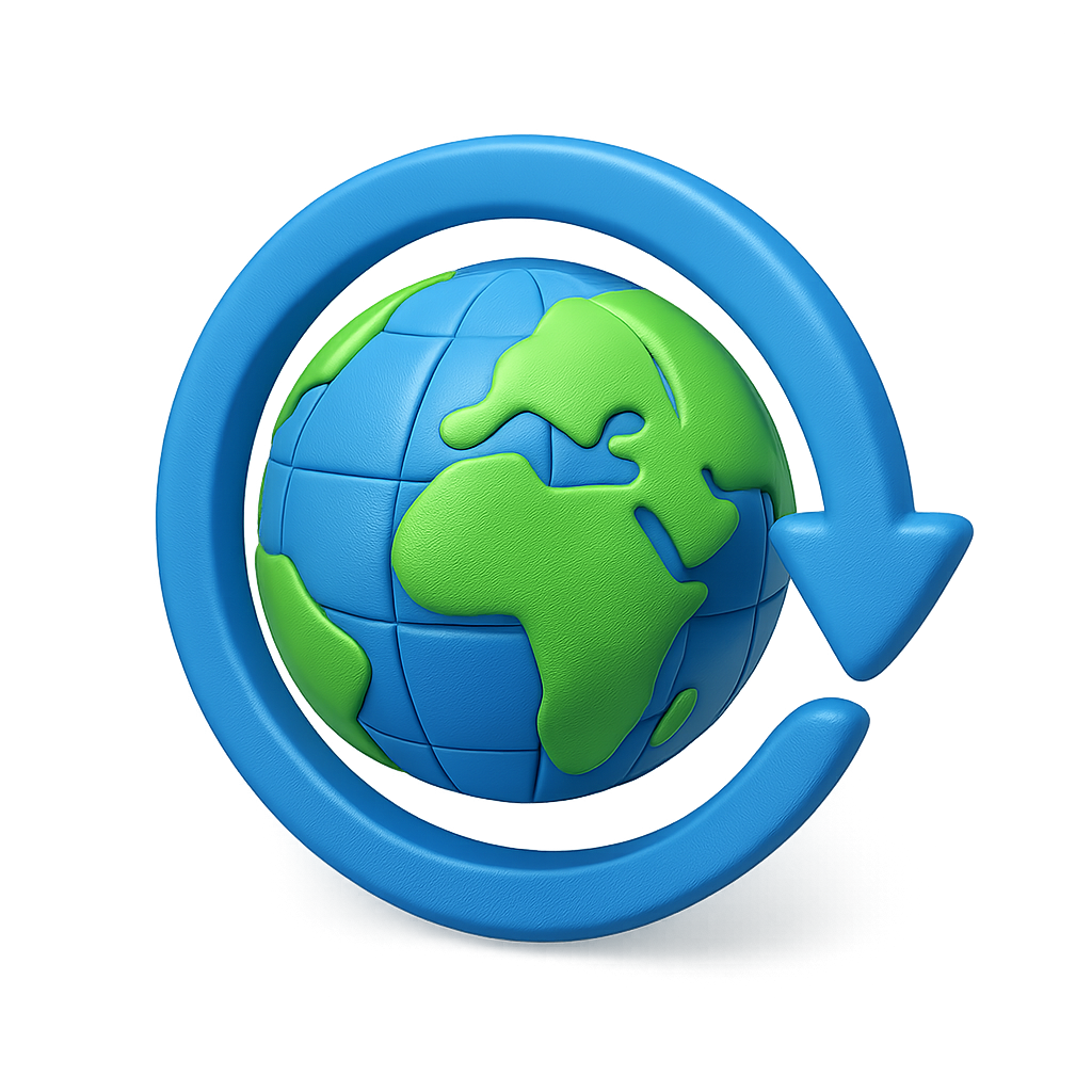 /Collection: /by davooda/Type: PNG/A visually appealing 3D globe icon featuring a circular arrow, emphasizing global connectivity. The globe depicts continents in vibrant green and blue, set against a subtle gradient background.