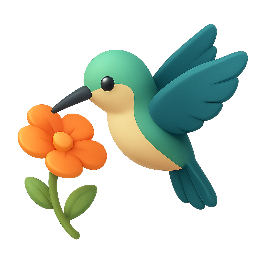 A vibrant 3D icon of a hummingbird hovering near an orange flower. The design features a three-quarter view with a soft, glowing background, emphasizing its volumetric shape.