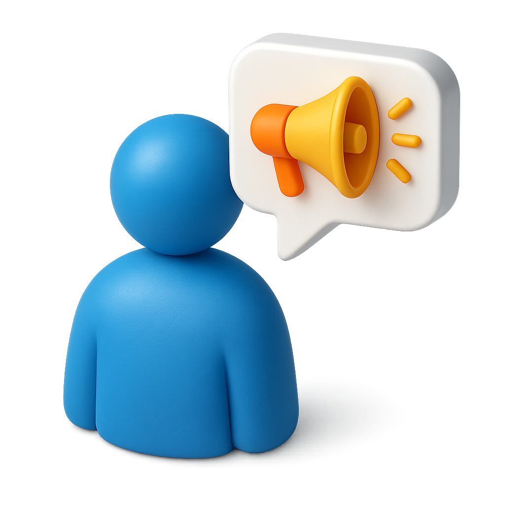 A stylized 3D icon depicting a person with a speech bubble featuring a megaphone, symbolizing customer voice and feedback. The design has a vibrant blue figure and an orange megaphone.