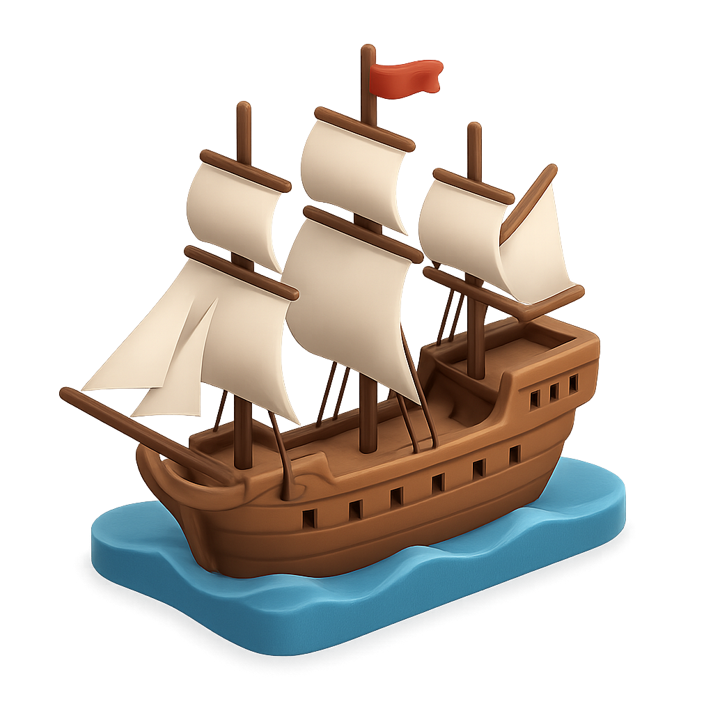 A detailed 3D icon of a war frigate sailing on water, featuring sails and a flag. The design has a volumetric feel with a transparent background.