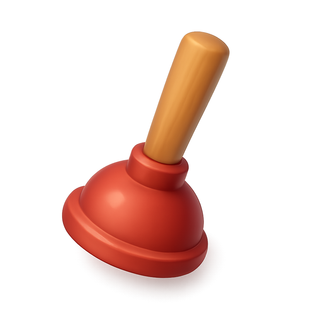/Collection: /by davooda/Type: PNG/A visually appealing 3D icon of a plumber's unclogging tool, featuring a red suction cup and wooden handle, rendered in isometric perspective on a transparent background.