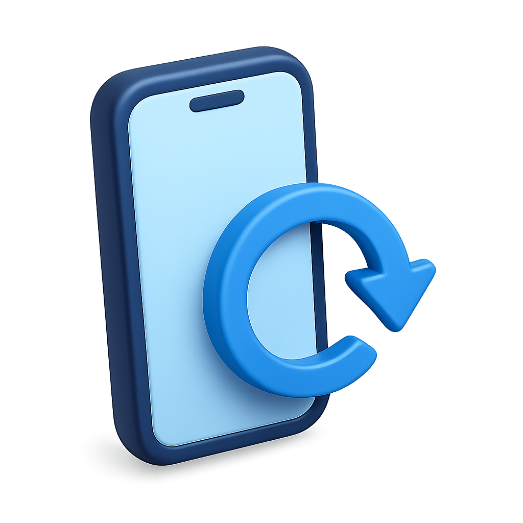 A 3D icon of a phone featuring a rotation arrow, designed with a transparent background and a three-quarter isometric view for a modern, volumetric appearance.