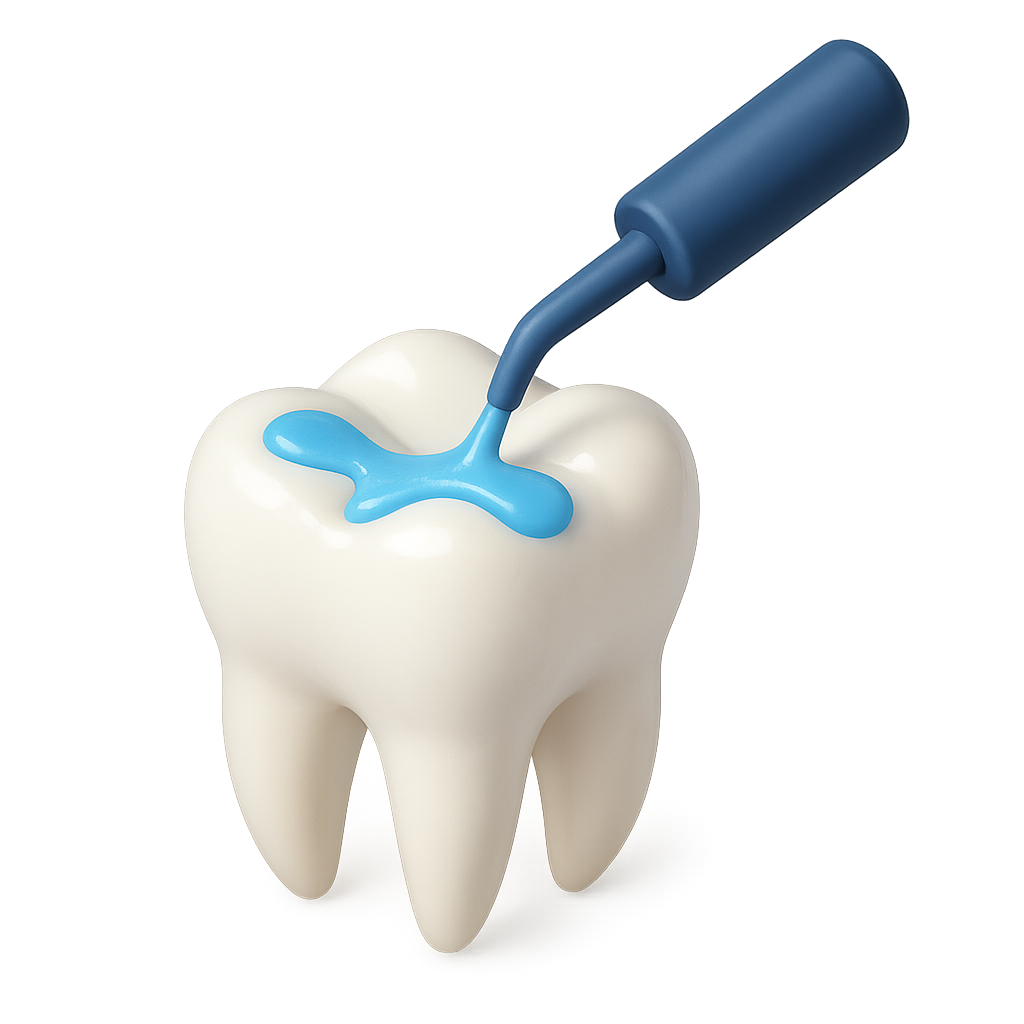 A 3D icon depicting a tooth being coated with a blue dental sealant. The scene features a volumetric and isometric view, highlighting the applicator and the glossy finish of the sealant.