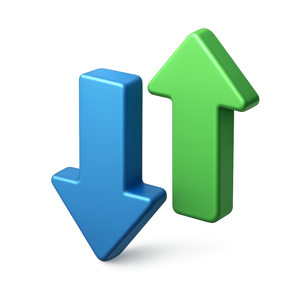 /Collection: /by davooda/Type: PNG/A stylized 3D isometric icon featuring a blue downward arrow and a green upward arrow. The design showcases a glossy finish with a three-quarter view, highlighting the volumetric aspect.