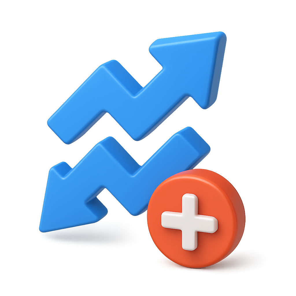 /Collection: /by davooda/Type: PNG/A vibrant 3D icon featuring two blue zigzag arrows and an orange circular plus sign, set against a transparent background. The design emphasizes a modern isometric style.