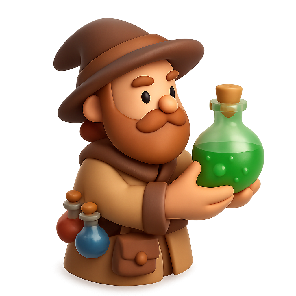 A whimsical 3D icon of an alchemist holding a green potion in a flask. The character features a brown hat, a beard, and potion bottles on their belt, set against a soft background.