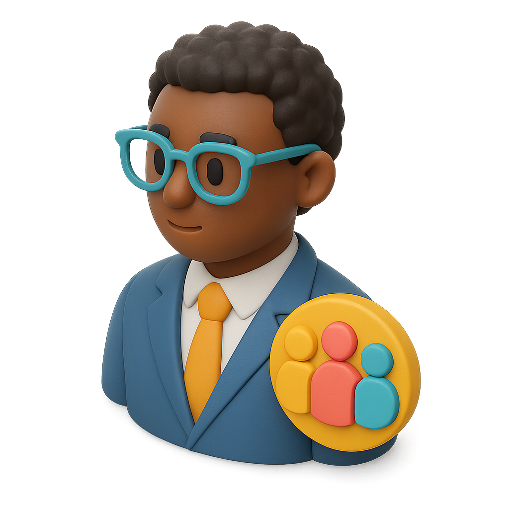 /Collection: /by davooda/Type: PNG/This image features a 3D icon of a diversity and inclusion officer, depicted in a three-quarter view. The character wears glasses and a suit, symbolizing professionalism, alongside a colorful inclusion badge.