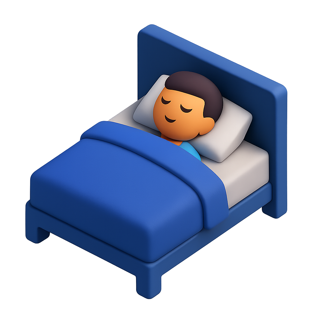 A 3D representation of a person peacefully resting in bed at night, featuring a blue blanket and a simple, isometric design with a transparent background.
