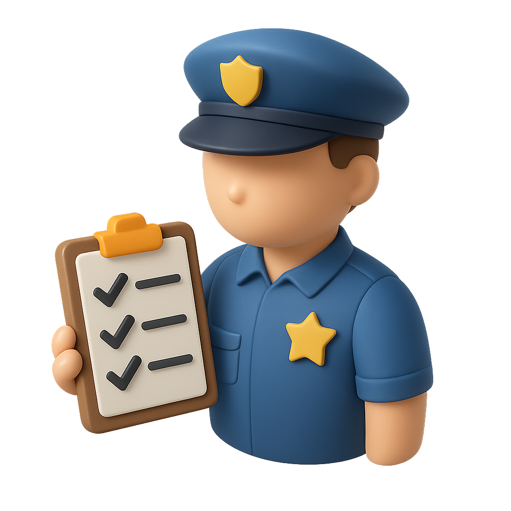 /Collection: /by davooda/Type: PNG/A 3D-rendered police officer icon holding a checklist. The figure features a blue uniform with a badge, designed in a three-quarter isometric view with a transparent background.