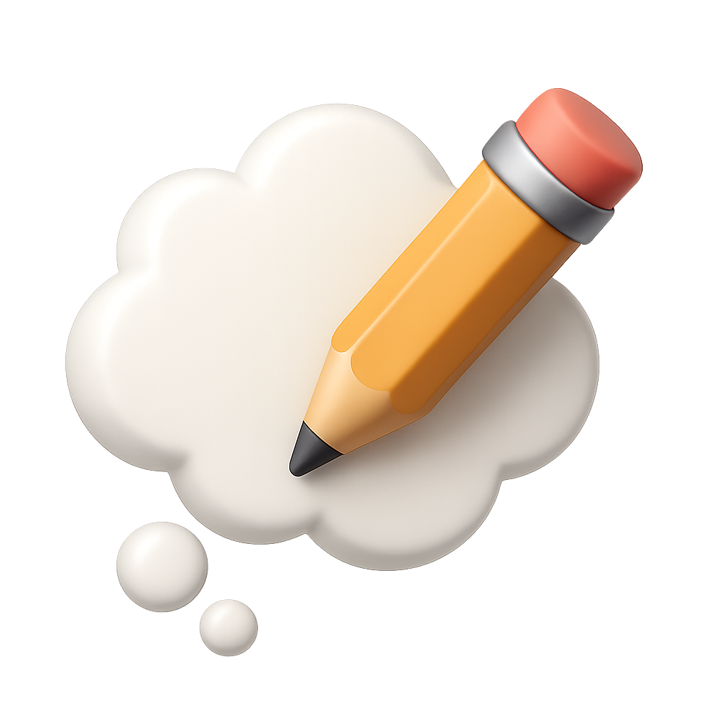 A 3D icon featuring a pencil emerging from a thought bubble, designed in a three-quarter view. The icon has a transparent background and a volumetric appearance.