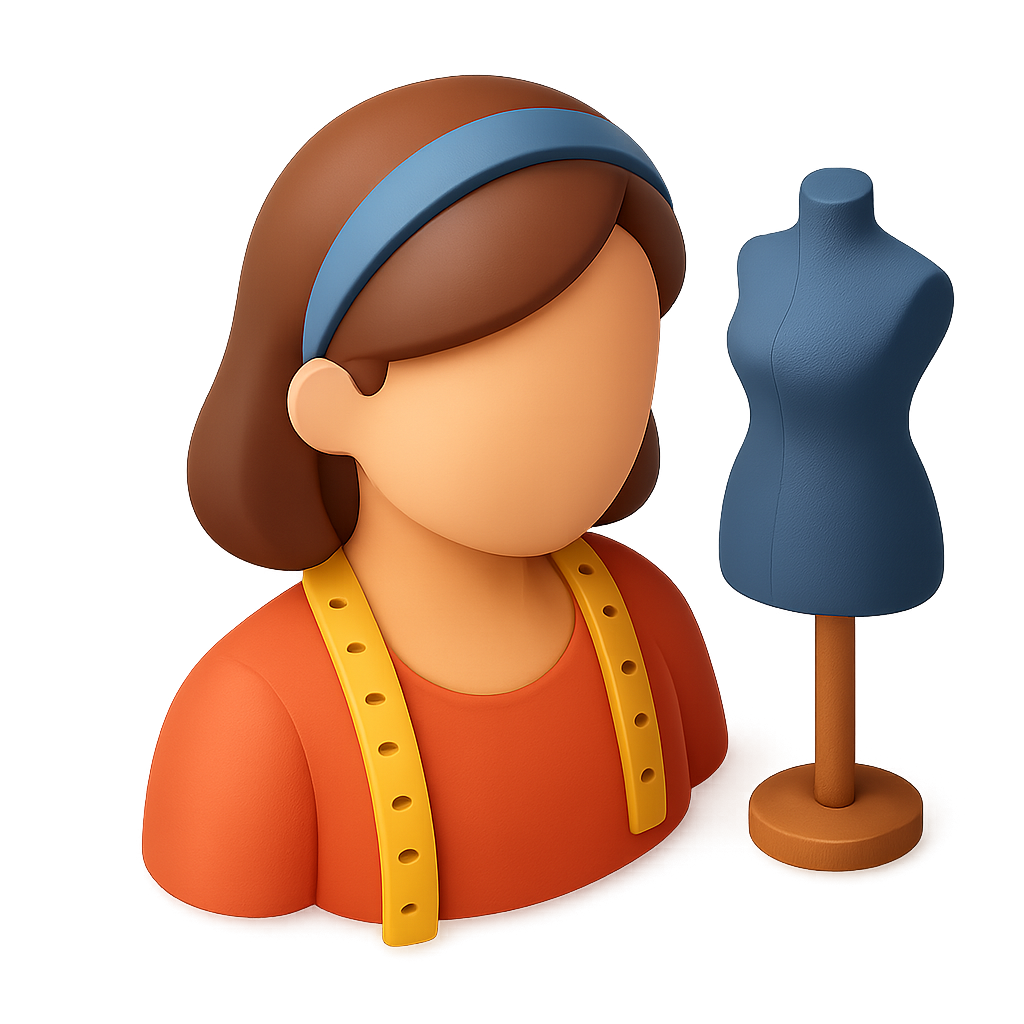 A stylized 3D icon of a seamstress featuring a character with a colorful outfit and a mannequin beside her, designed in a volumetric and isometric style.
