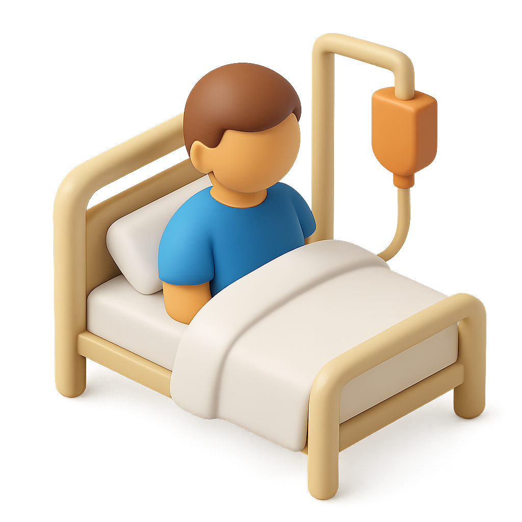 This image features a 3D icon of a hospital patient resting in bed, with a transparent background. The patient is depicted in a blue shirt, with an IV attached, creating a volumetric isometric effect.