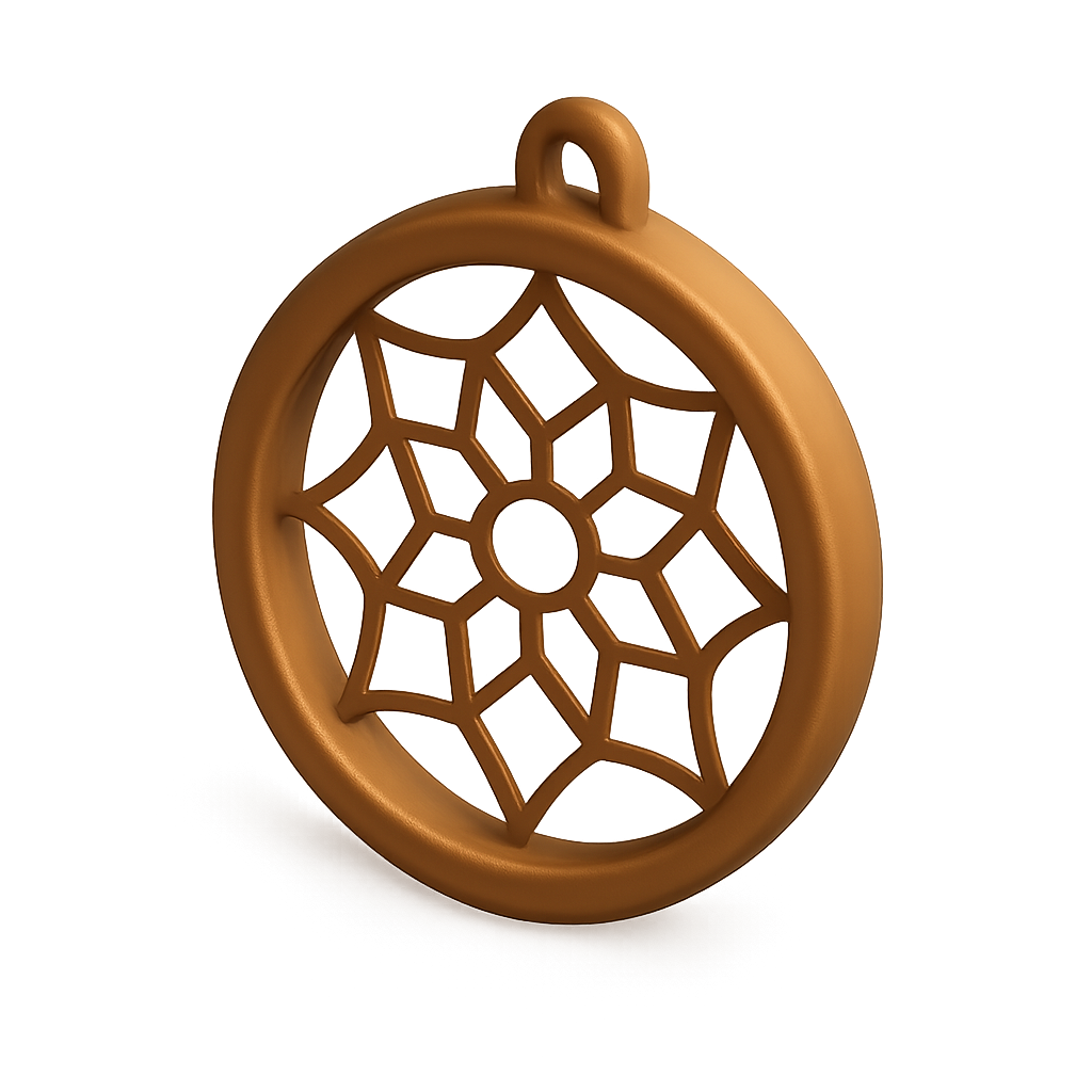This image showcases a stylized dreamcatcher icon rendered in 3D, featuring a circular web design with a smooth, rounded frame. The warm, earthy tone enhances its aesthetic appeal.