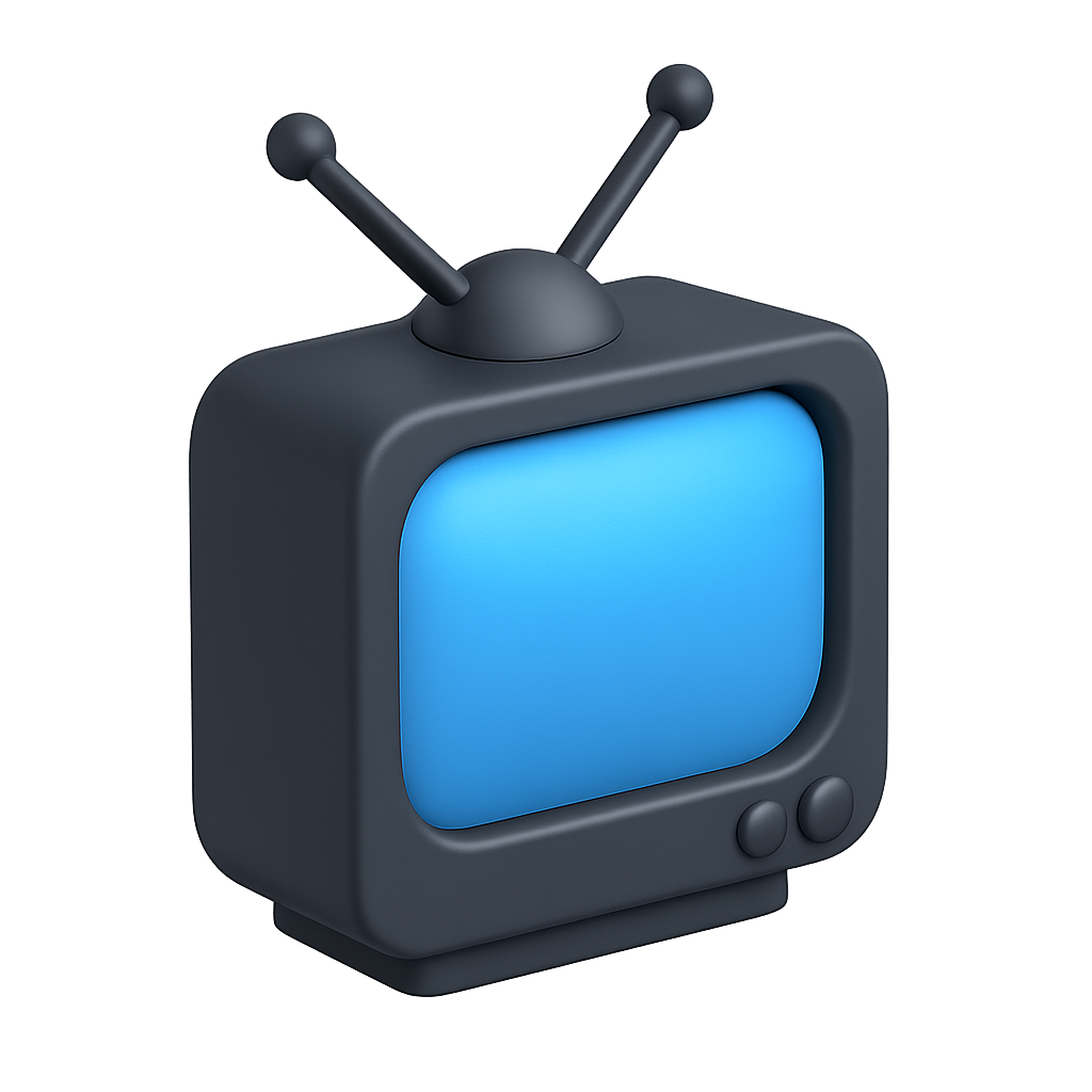 A stylized 3D television icon featuring a blue screen and antennae, presented in an isometric view with a glossy finish, set against a dark background.