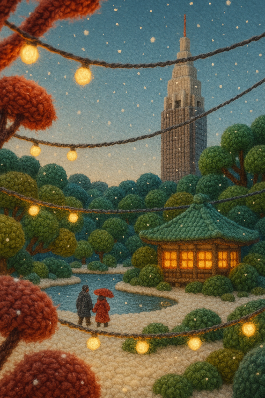 A vibrant winter scene in Shinjuku Gyoen, Tokyo, featuring colorful trees and a cozy gazebo. Snow gently falls, creating a festive atmosphere with glowing lights and small figures enjoying the park.