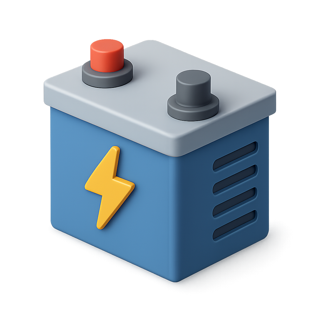 A stylized 3D battery bank icon featuring a blue body, red and gray terminals, and a lightning bolt symbol. The design is isometric and has a transparent background.