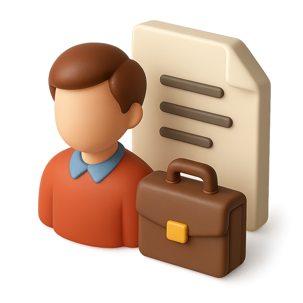 /Collection: /by davooda/Type: PNG/A stylized 3D icon featuring a person with a briefcase beside a document. The design is isometric with a volumetric feel, showcasing a unique business theme.
